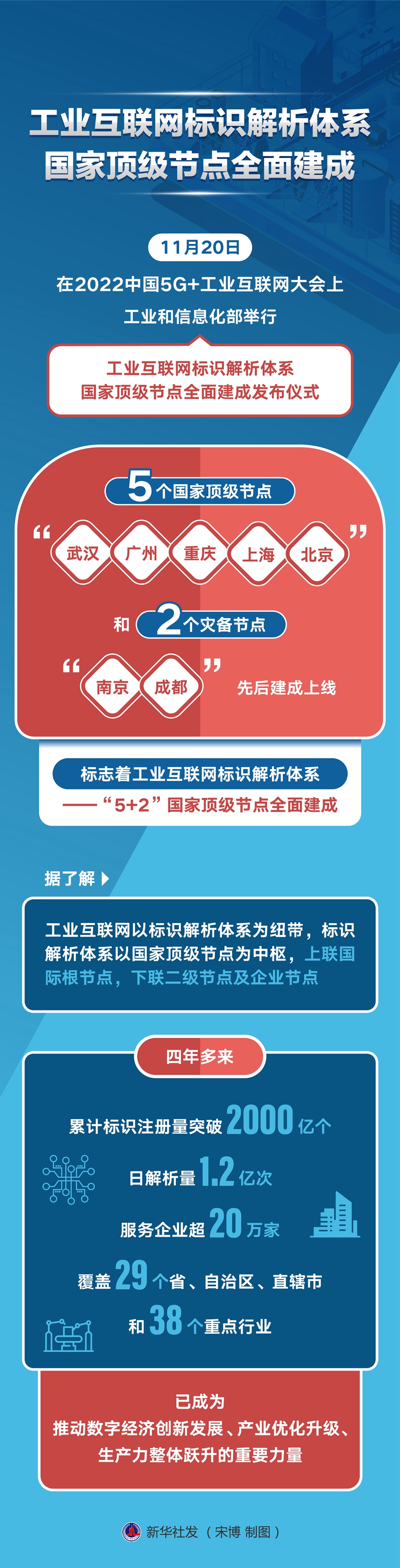 新华社武汉11月20日电 20日,在2022中国5G+工业互联网大会上,工业和信息化部举行工业互联网标识解析体系国家顶级节点全面建成发布仪式,标志着工业互联网标识解析体系——“5+2”国家顶级节点全面建成。