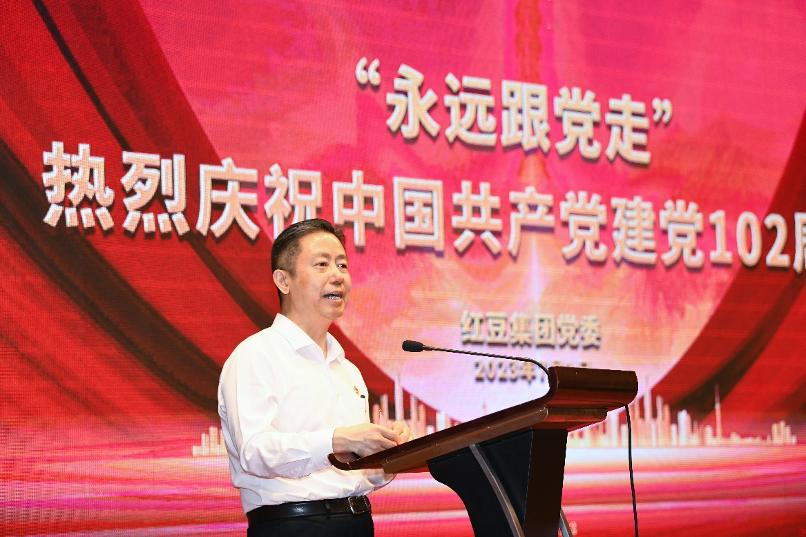 7月1日,红豆集团党委举行“永远跟党走”热烈庆祝中国共产党建党102周年活动,集团党委班子、高质量发展“三自六化”先锋和高质量发展先锋堡垒团队负责人等同志参加了活动。红豆集团党委书记、董事局主席周海江为党员们上了一堂生动党课,并与大家一起合唱《没有共产党就没有新中国》。